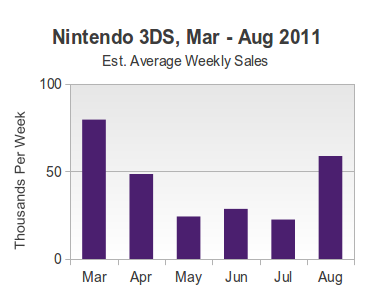 As a result of the price drop, the Nintendo 3DS saw sales increase from about 22,500 units per week in July to over nearly 59,000 units per week in August.