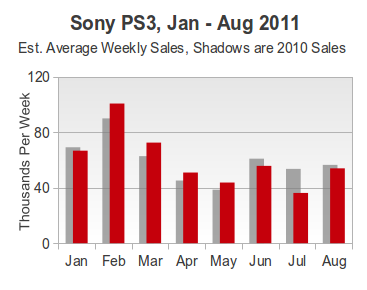 The figure below shows the estimated average weekly sales rates for the PS3 for each month this year. The shadowed bars are the same figures but for 2010.