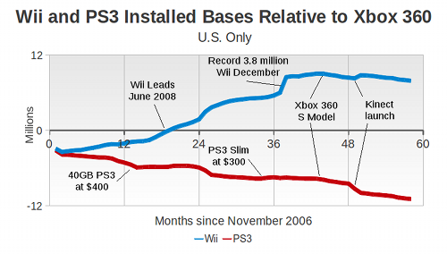 This shows just how far Sony has gotten behind its two rivals, the rapid growth and slowdown of the Wii, and the release of several key hardware models. It also shows the net effect of Sony's price cuts: far from helping Sony gain ground, they have merely slowed the rate at which the PS3's base has fallen behind.
