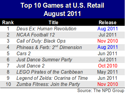 Indeed, as the August 2011 top 10 list released by the NPD Group shows, only two new releases (highlighted in blue) made the cut, Deus Ex: Human Revolution and Phineas and Ferb: Across the 2nd Dimension.