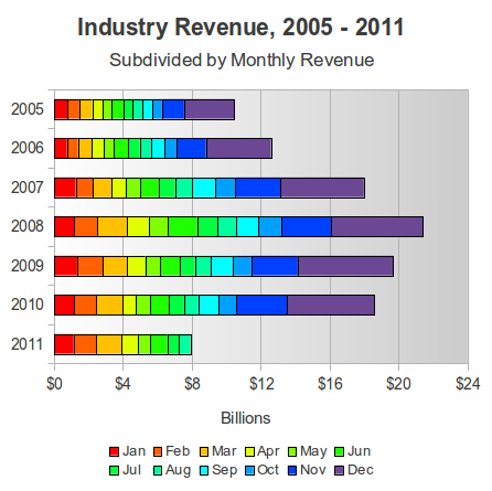 Earlier this year we held out hopes that the industry would pull out a year with retail revenues similar to 2010, around $18.6 billion. However, as that chart above makes abundantly clear, the revenue picture for 2011 looks quite grim compared to last year. If retail sales are flat for the remainder of the year, then total retail sales will come in around $18.1 billion in 2011.